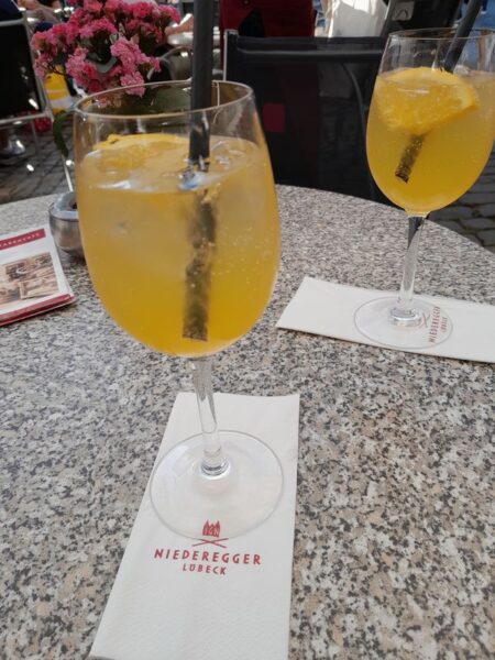 Am Markt müssen wir unbedingt eine Ruhepause einlegen. Die Füße qualmen schon. Da genehmigen wir uns bei tiefer werdendem Sonnenstand schnell noch einen Sanddorn-Spritz.
