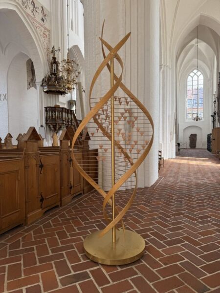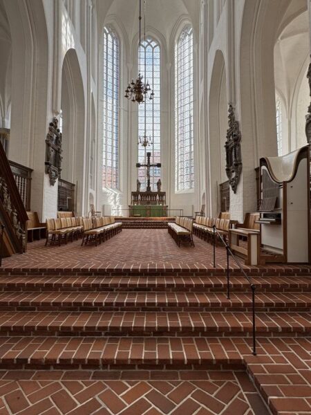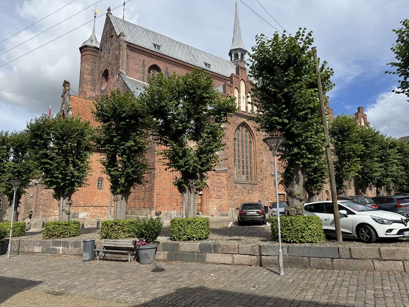 An einer Kreuzung der Fußgängerzone hören wir von links Blasmusik und Getrommel. Wir schauen nach, was dort los ist und geraten in eine militärische Veranstaltung zur Ablegung des Fahneneids. Wir verziehen uns und kommen zum „Dom von Haderslev“ (Marienkirche). Die Kirche stammt aus dem 13. Jhdt. und eine Besonderheit sind fast 16 m hohen Chorfenster.