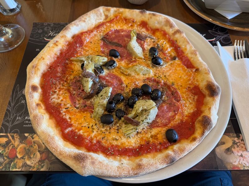 Nicht weit von der Kirche entfernt, entdecken wir das italienisches Restaurant „Firenze“. Dort gehen wir essen. Und was haben wir einen Spaß, hier können wir nach Wochen endlich die Speisekarte wieder lesen.