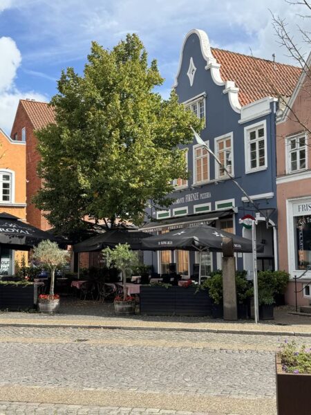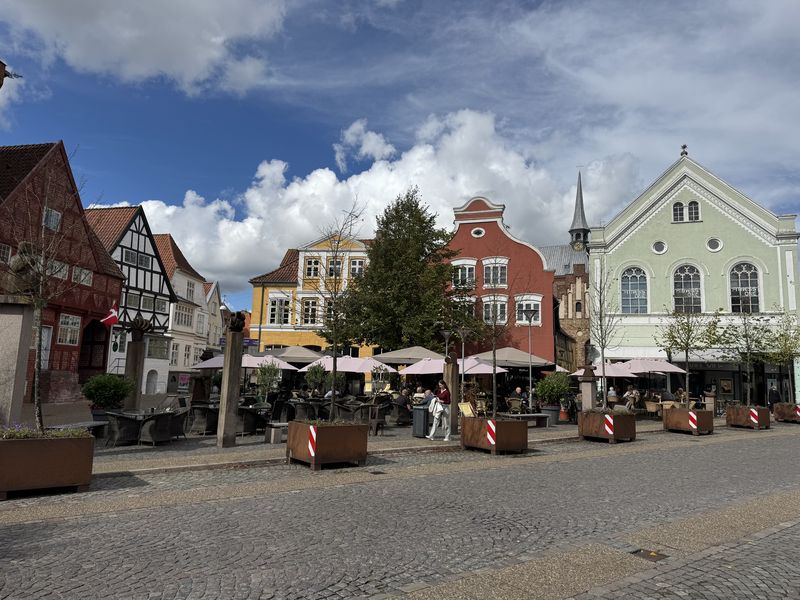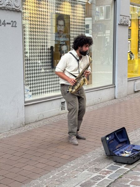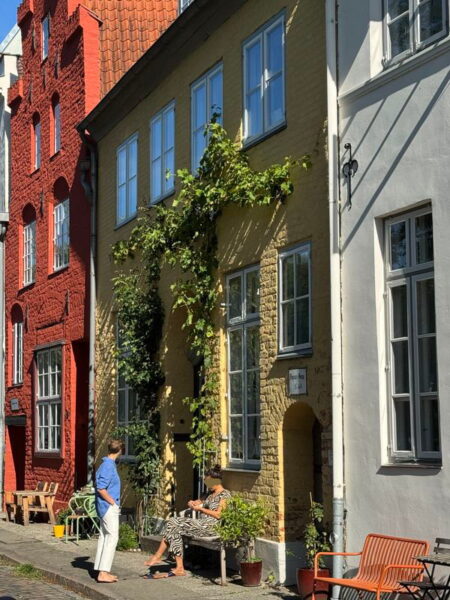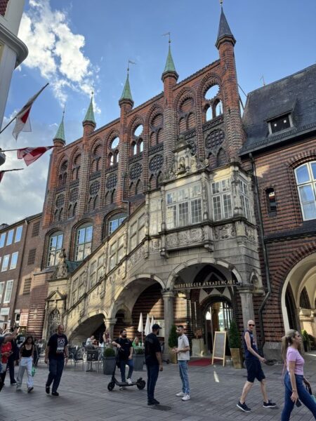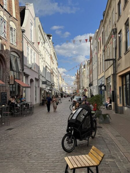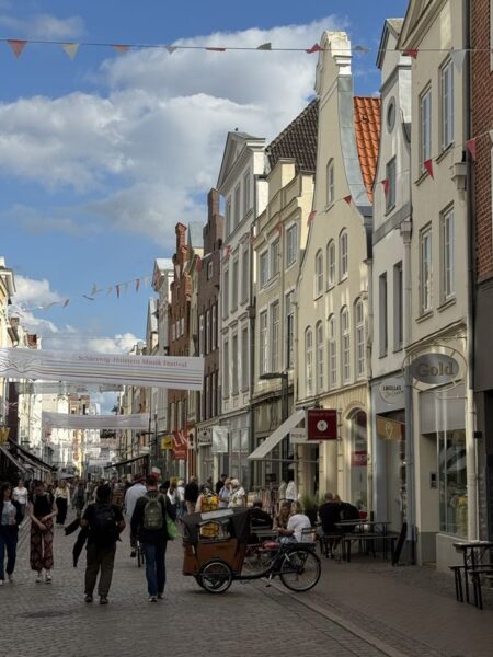 Direkt beim Historischen Rathaus geht es links in die Hüxstraße rein. Dort scheint so richtig was los zu sein. Zur Zeit ist das Schleswig-Holstein-Musikfestival und überall finden irgendwelche Aktionen statt. Dort sind wir richtig. Und gutes Essen gibt es im Café Central.