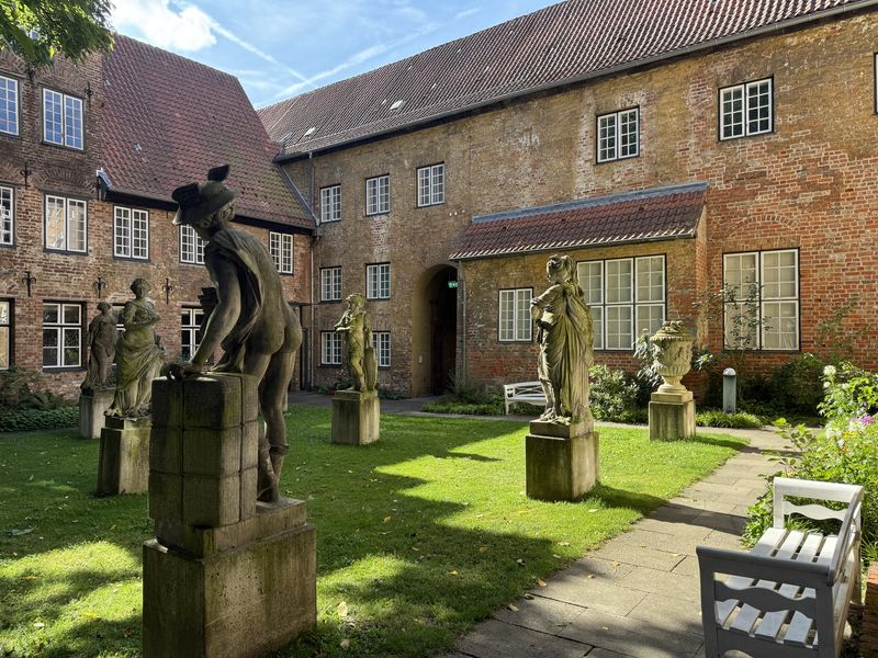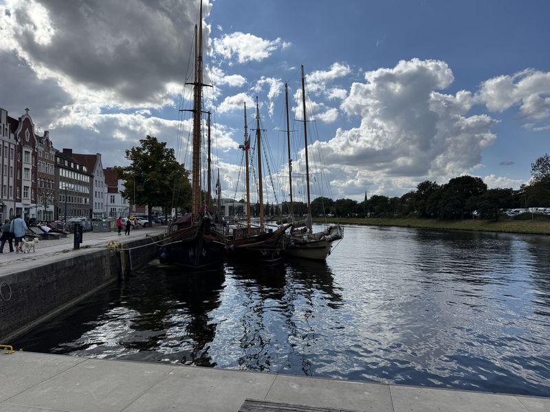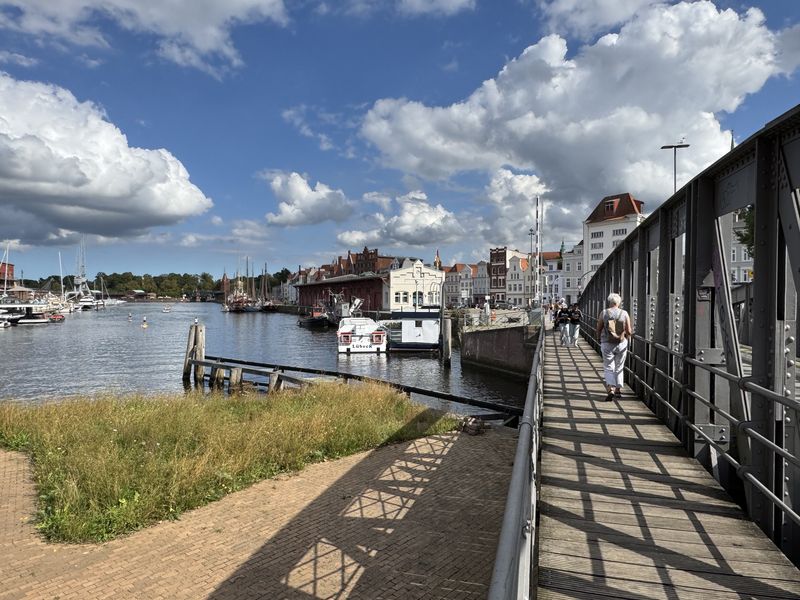 Heute wollen wir auf jeden Fall noch um Hamburg herum kommen, damit wir dem Verkehr am Werktag entgehen können. Trotzdem entscheiden wir uns dafür, am Vormittag einen Spaziergang entlang der Trave in die Innenstadt zu machen, und noch eine Ausstellung in der Kunsthalle St. Annen zu besuchen.
