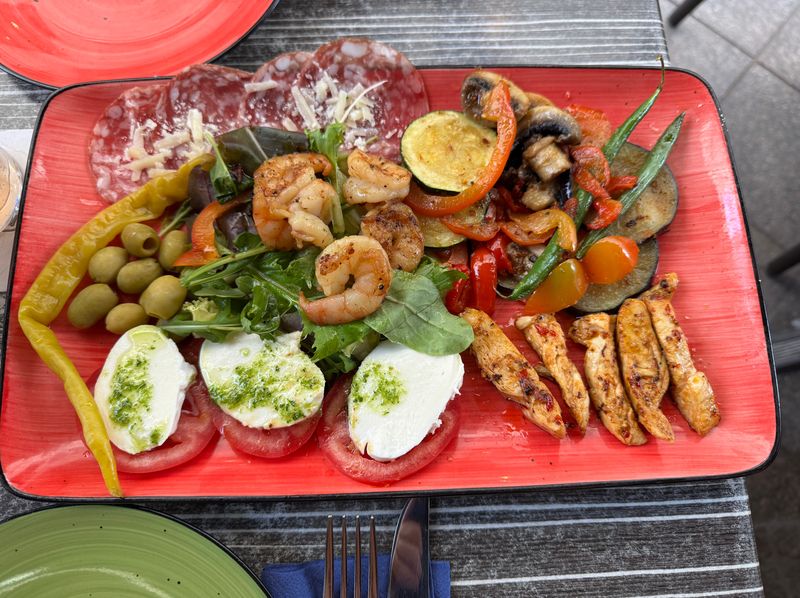 Nach der Platzwahl gehe ich an die Theke und lasse uns nach meinen Vorstellungen einen Teller mit kalten und warmen Leckereien zusammenstellen.