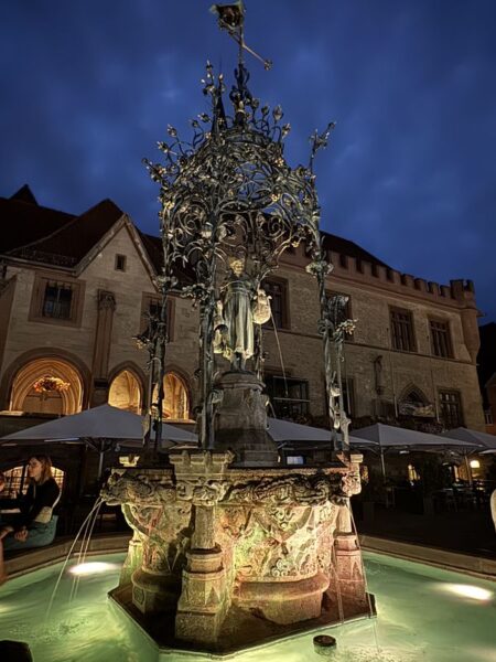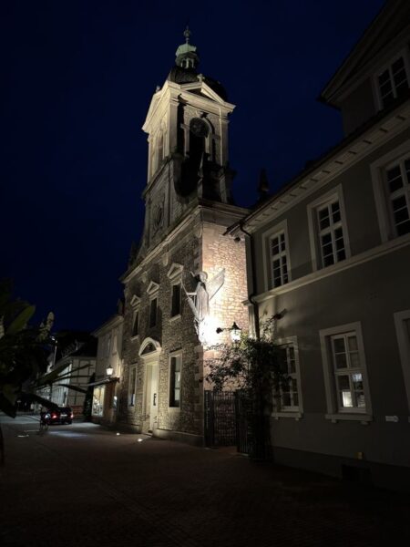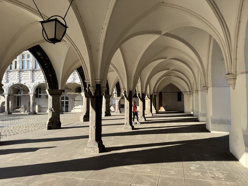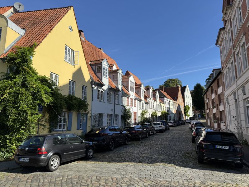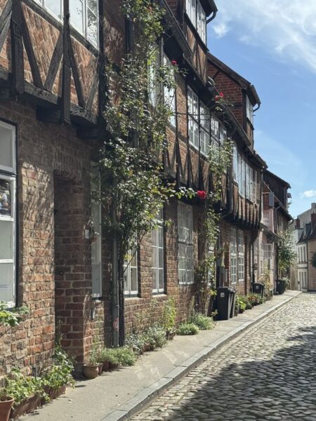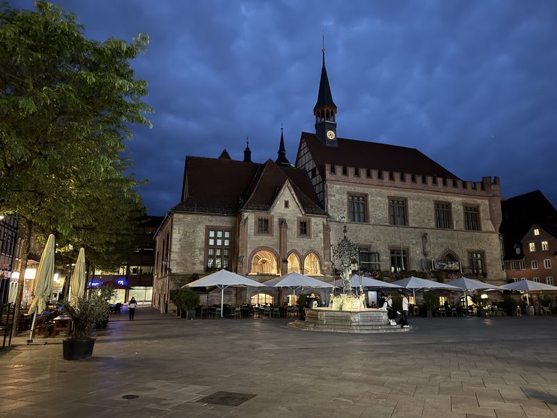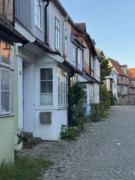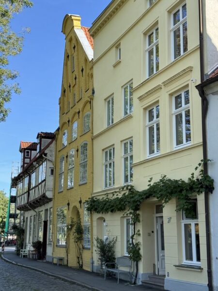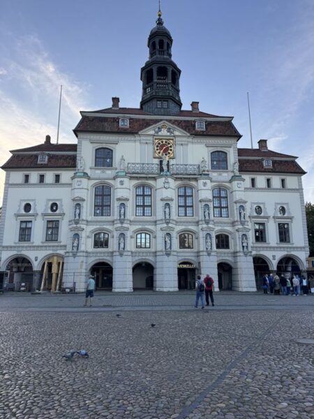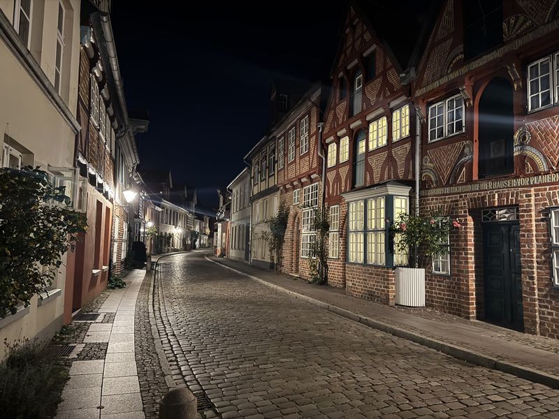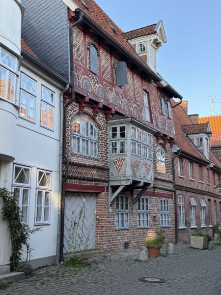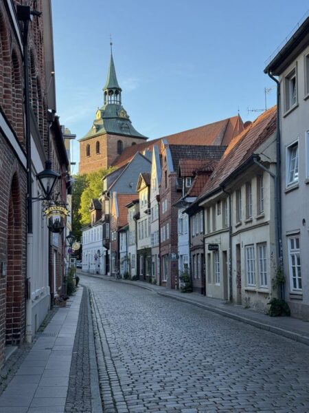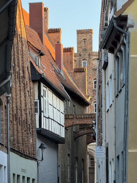 Gegen 18.30 Uhr machen wir uns zu einem Stadtspaziergang auf. Wir waren ja schon mehrmals hier. Es ist aber immer wieder schön, durch die Gassen der Altstadt zu laufen. Diesmal wählen wir nach links gehend den Bereich bis hin zur St.-Michaelis-Kirche, und dann schlagen wir einen Bogen zum Rathaus am Marktplatz. Dabei wechselt die Bebauung sichtlich von der Wohnbebauung zum Kaufmannsstil.