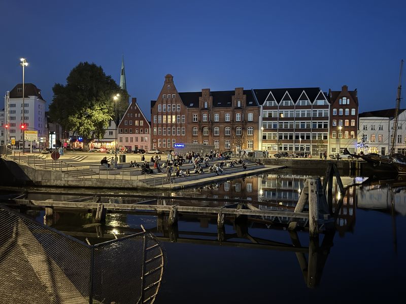 Im Abendlicht spazieren wir noch ein kleines Stück an der Trave entlang. Auf den Stufen der Wassertreppe sammeln sich schon ein paar „Sonnenanbeter“ für einen Schluck in Gemeinschaft.