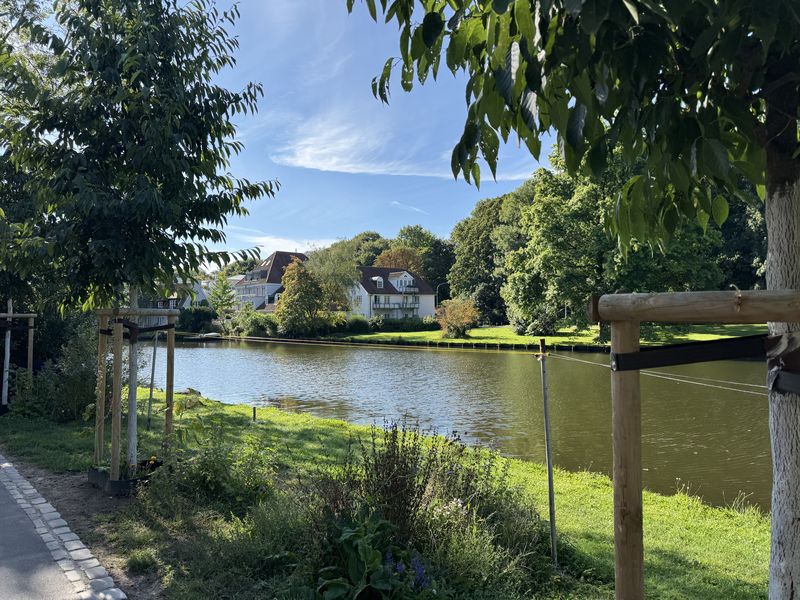 Direkt neben unserem Übernachtungsplatz befindet sich der ausgedehnte Kurpark Bad Nauheims. Mit den ausladenden Bäumen und der Wasserlandschaft ist dies genau das Richtige für einen ausgiebigen Spaziergang bei den heißen Temperaturen.