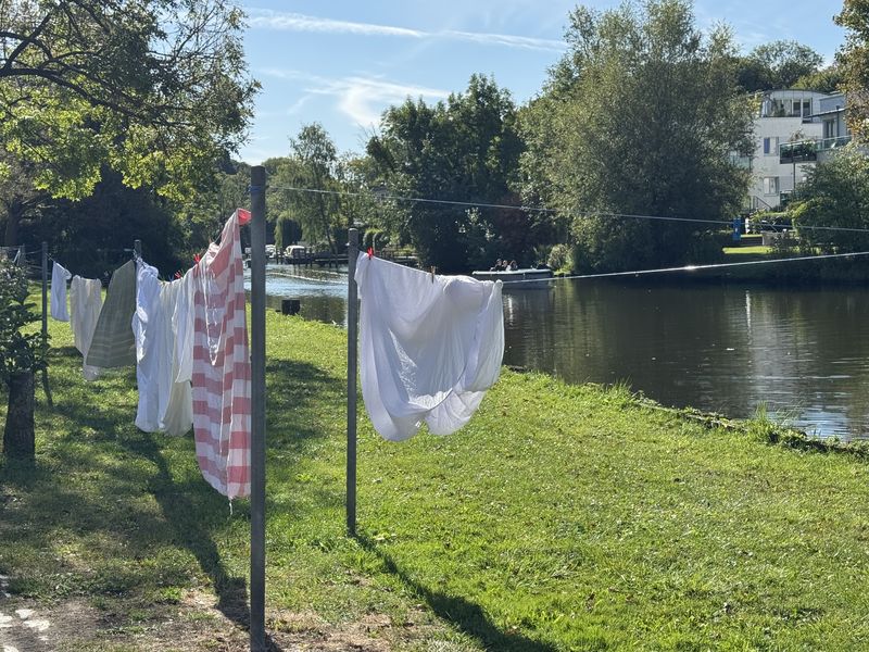Wir sind die letzten Tage genug gefahren, deshalb verlängern wir hier unseren Aufenthalt noch um einen Tag. Das Wetter ist herrlich um richtig zu faulenzen, und Schiffe fahren auch genug vorbei. Es gibt immer was zu sehen. Außerdem können wir auf einen freigewordenen Platz direkt zum Wasser hin umziehen, wo wir auch noch mehr Schatten haben.