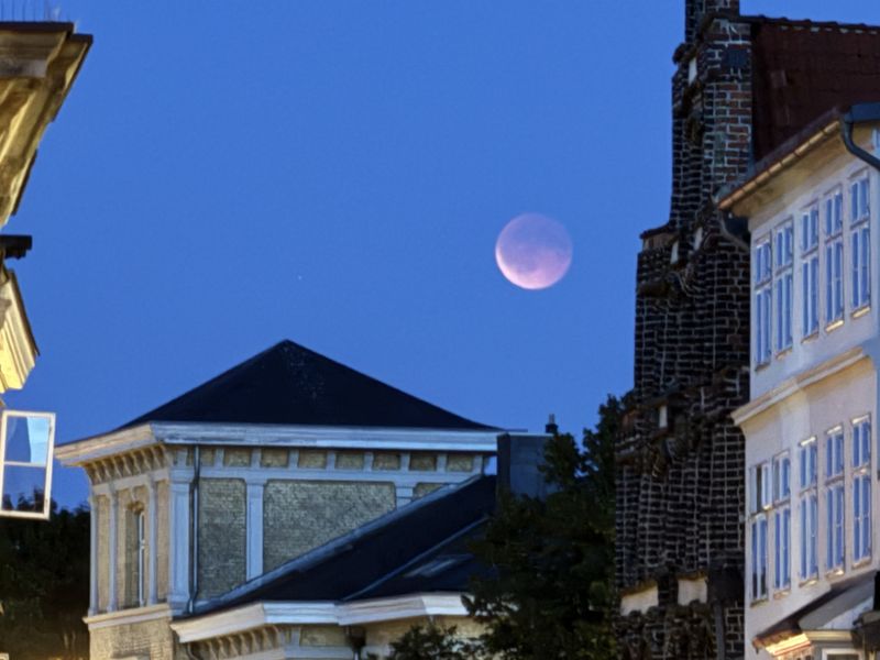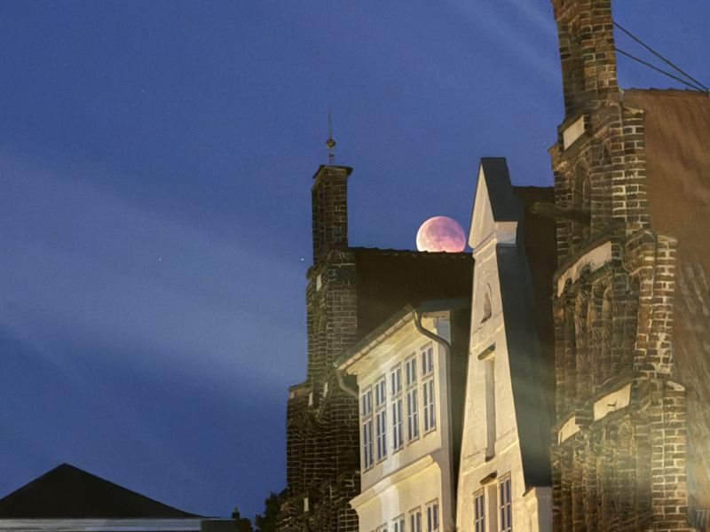 Wir haben uns in den Außenbereich der ältesten Kneipe Lüneburgs, dem PONS, platziert, und genießen bei Grauburgunderschorle und Wendlandbräu Märzen die Aussicht auf die Lünertorbrücke und das dortige Treiben, und die Wanderung des sogenannten „Blutmondes“.
