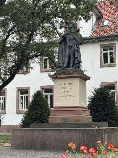 Bei der Aula am Wilhelmsplatz steht die Aula der Universität, ständig beaufsichtigt vom Standbild von Wilhelm IV..
