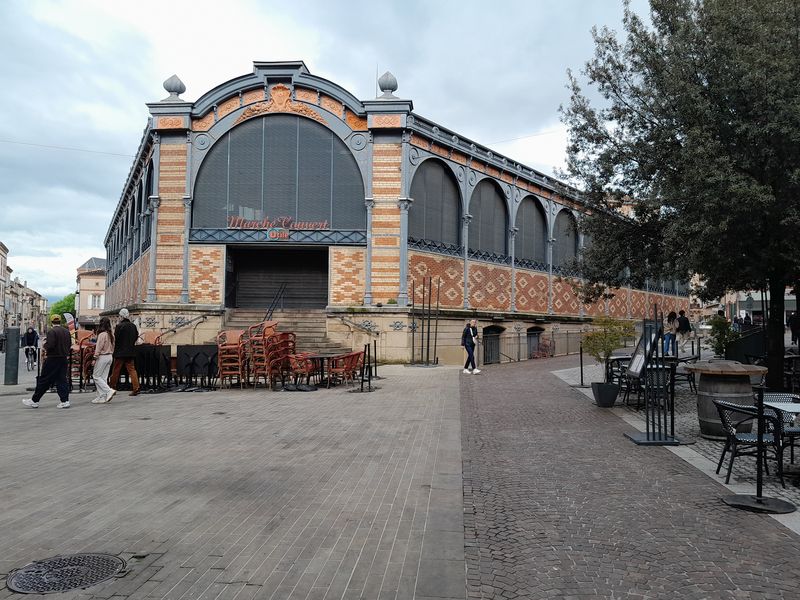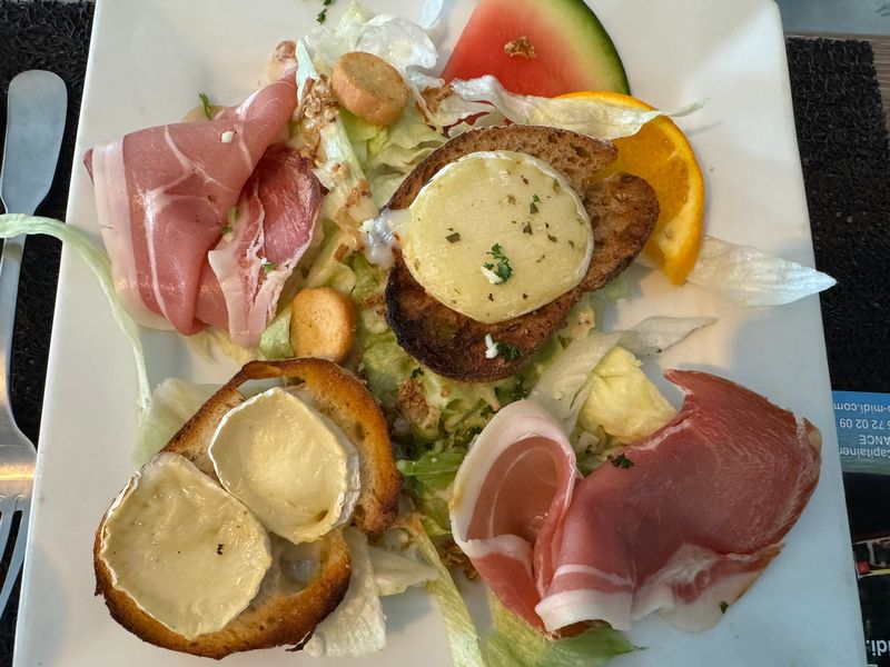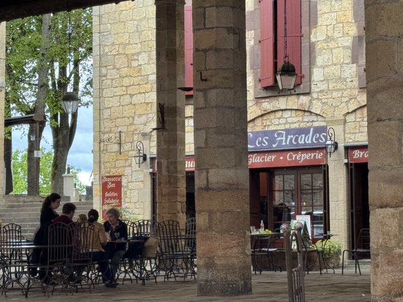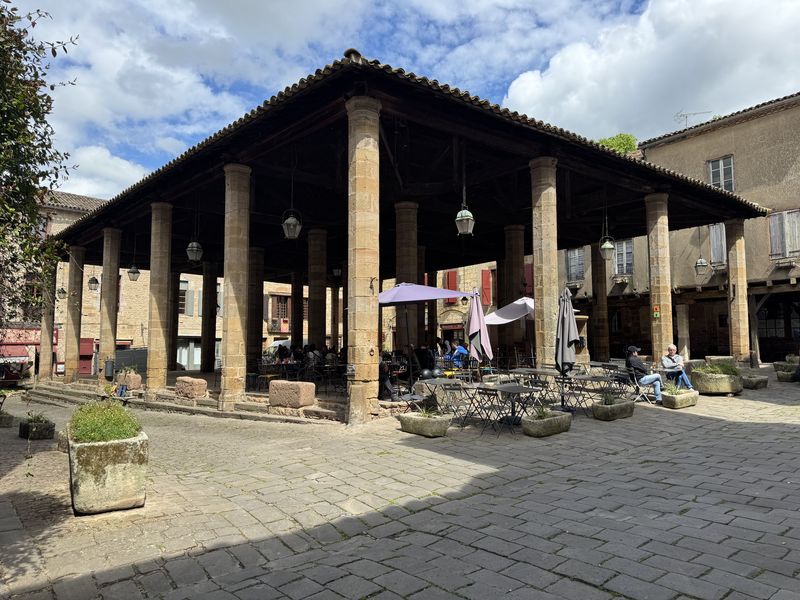 Nachdem wir noch die Porte du Vainquer und die Porte de Rous passiert haben, gelangen wir in den inneren Bezirk hinter den Stadtmauern (Remparts). Bei der offen gebauten Markthalle, Halle de Cordes-sur-Ciel, mit ihrem 100 m tiefen Brunnen, sehen wir das Restaurant „Les Arcades“. Das ist jetzt genau das richtige für uns, ein Restaurant mit regionaler Küche. Leider hat es mehr versprochen, als es dann gehalten hat.