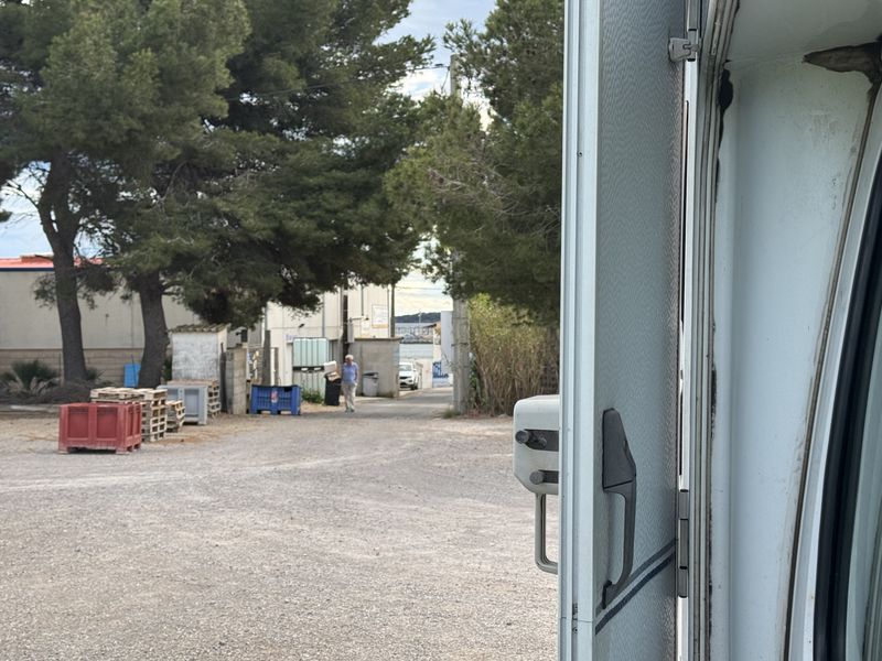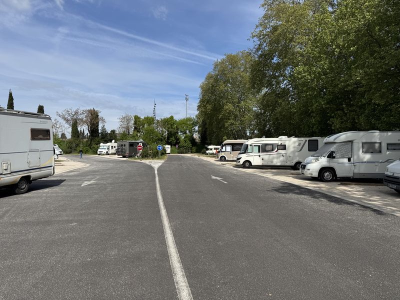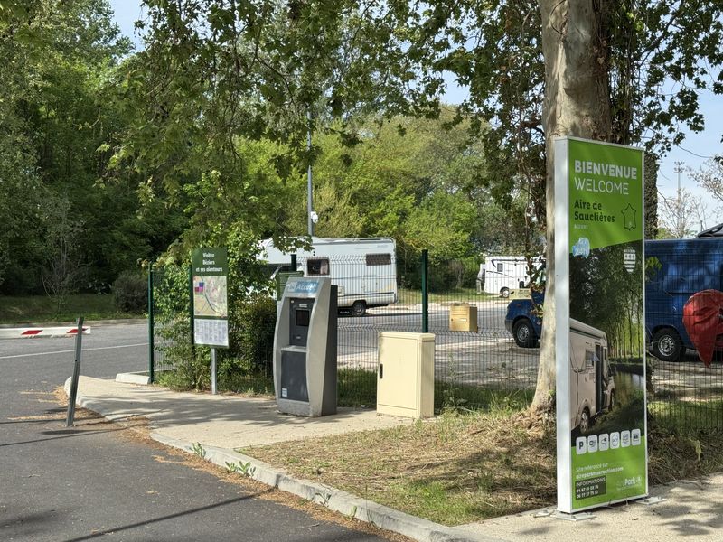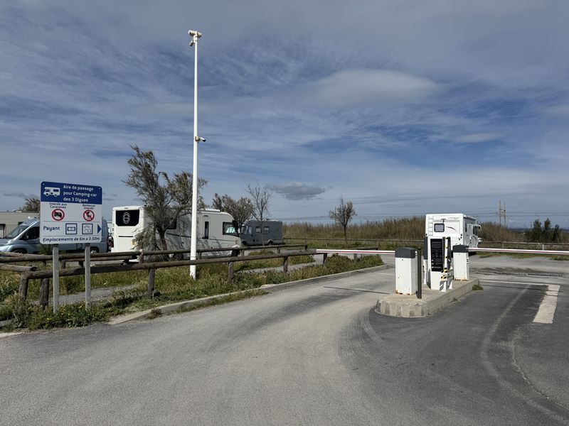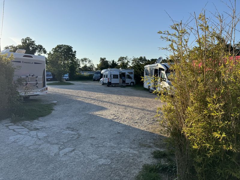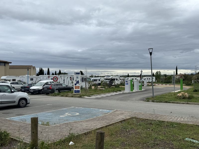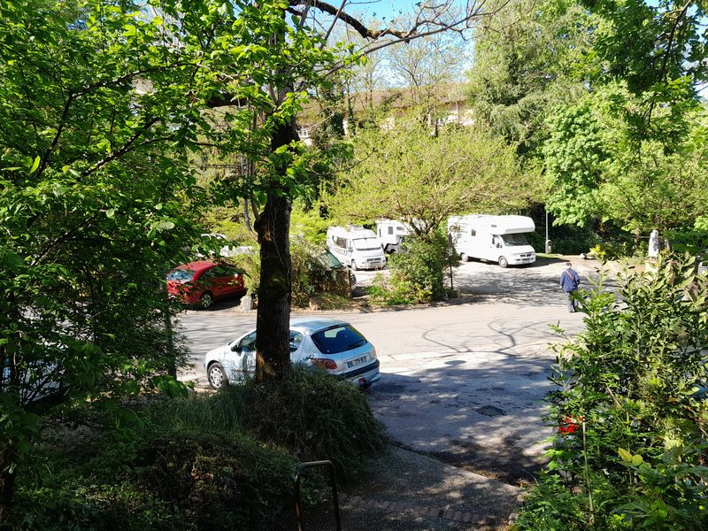 Bei der Ausfahrt von dem Großparkplatz ist für uns die Ausfahrtschranke geschlossen, die Einfahrtschranke war aber offen. Nach einer langen Kurblerei mit dem Wohnmobil kommen wir durch die Einfahrt von dem Platz runter, und können zu dem CCP-Wohnmobil-Stellplatz mit V+E und Strom (Gebühr EUR 18,32) in der Rue des Glaieuls fahren. Dieses Mal geht auch die Schranke anstandslos auf.