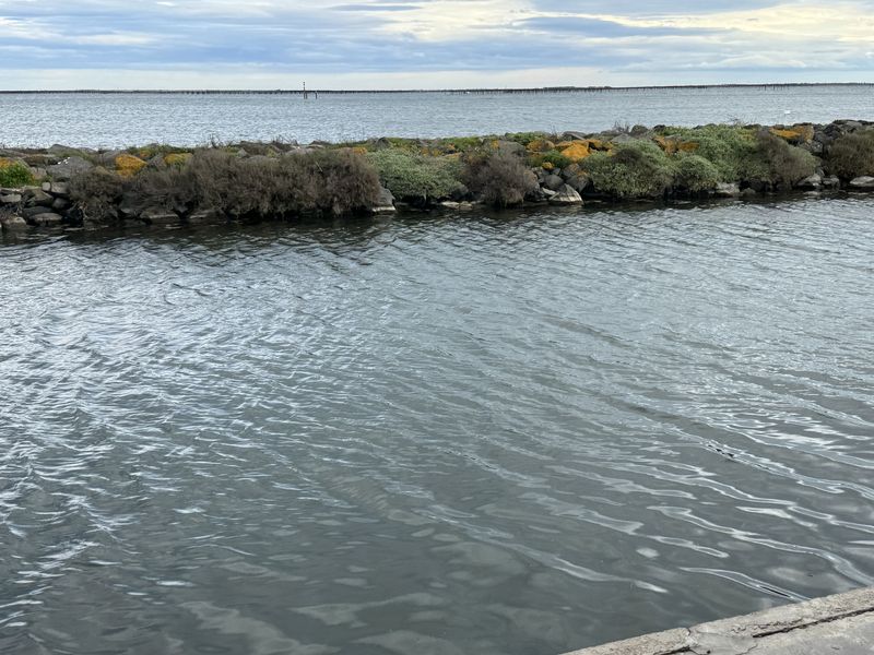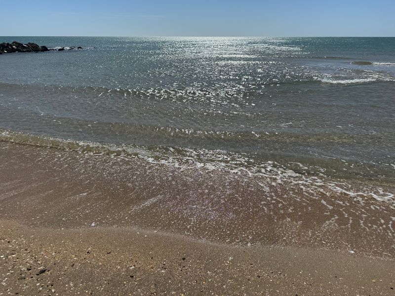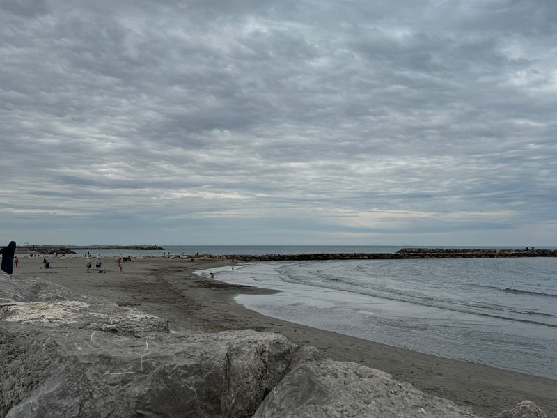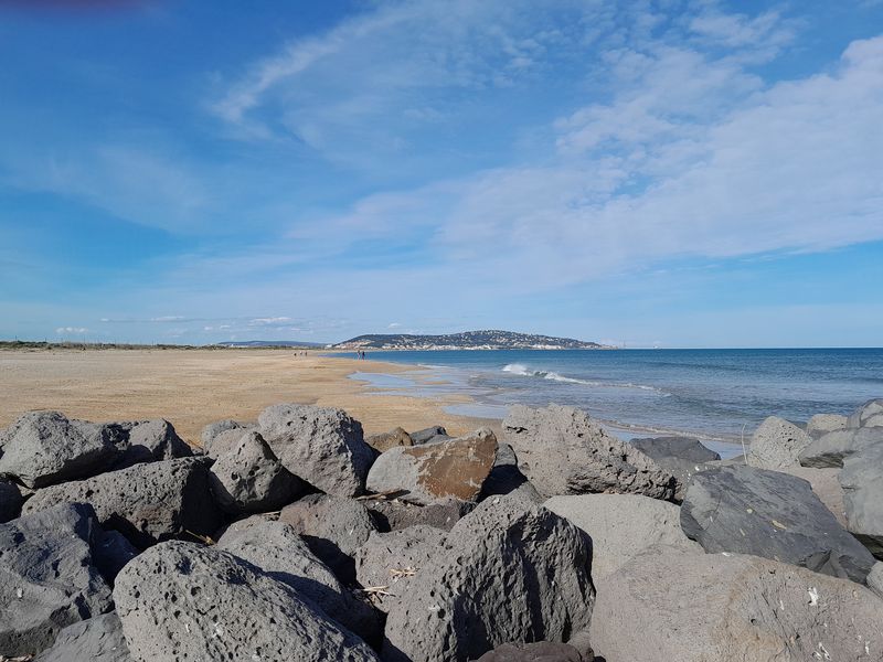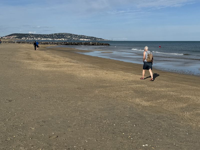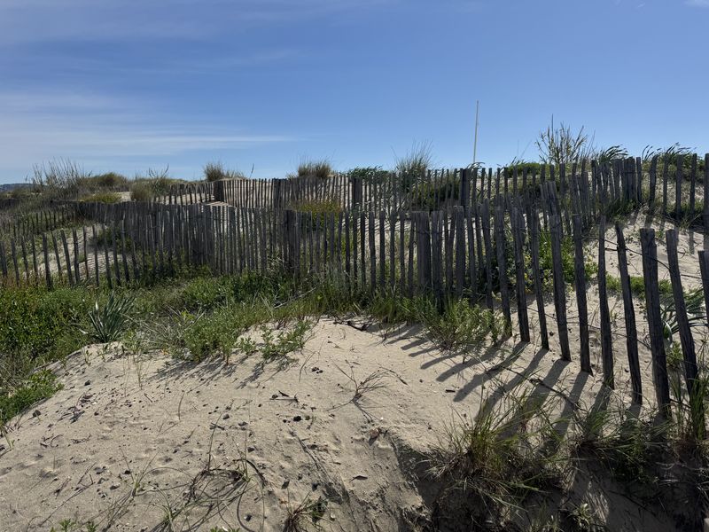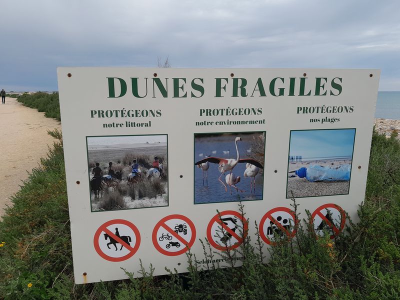 Den riesigen Plage Est, wo wir 1974 noch auf einer Fläche von bestimmt 400.000 qm „wild“ gezeltet haben, gibt es nicht mehr. Das Meer hat sich den gesamten Strandbereich mit einer Tiefe von 500 bis 600 m total einverleibt. Alle örtlichen Maßnahmen zur Befestigung mithilfe von Dünen sind fehlgeschlagen. Mittlerweile werden sogar teilweise die großen Felsgestein-Befestigungen zum Schutze des breiten Schotterweges unterspült.