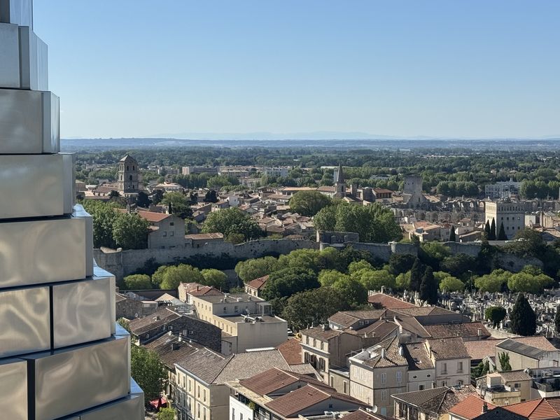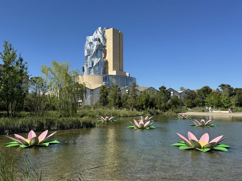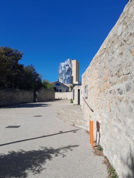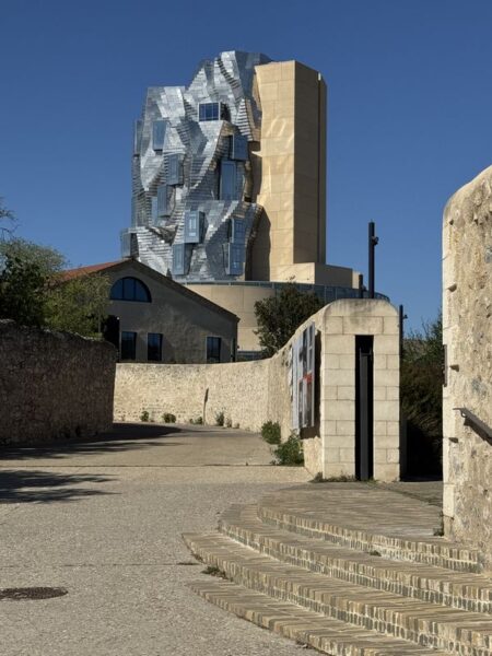 Verwirklicht hat dies 2010 auf einem stillgelegten Industriegelände die Stiftung von Maja Hoffmann (Hoffmann-La Roche). Weithin sichtbar ist der 56 m hohe Turm, der von dem Star-Architekten Frank Gehry entworfen wurde. Er soll Landschaft und Himmel widerspiegeln. Der Sockel besteht aus einem gläsernen Rundbau, in Anlehnung des römischen Amphitheaters in Arles. Die zackigen Formen darüber weisen auf die Alpilles hin, und bstehen aus 11.000 Edelstahlrauten, die das Licht des Südens widerspiegeln.