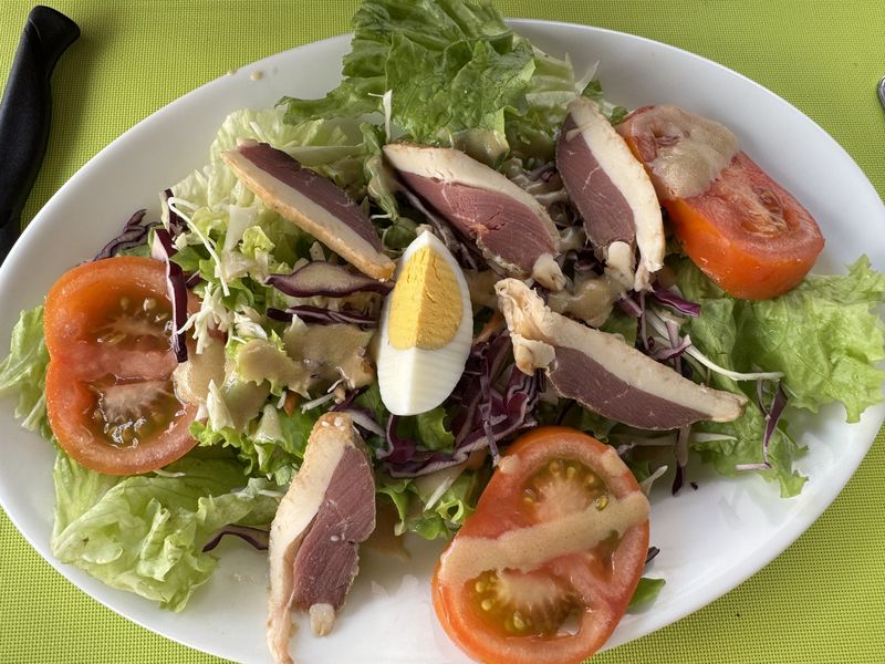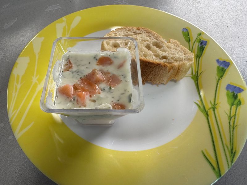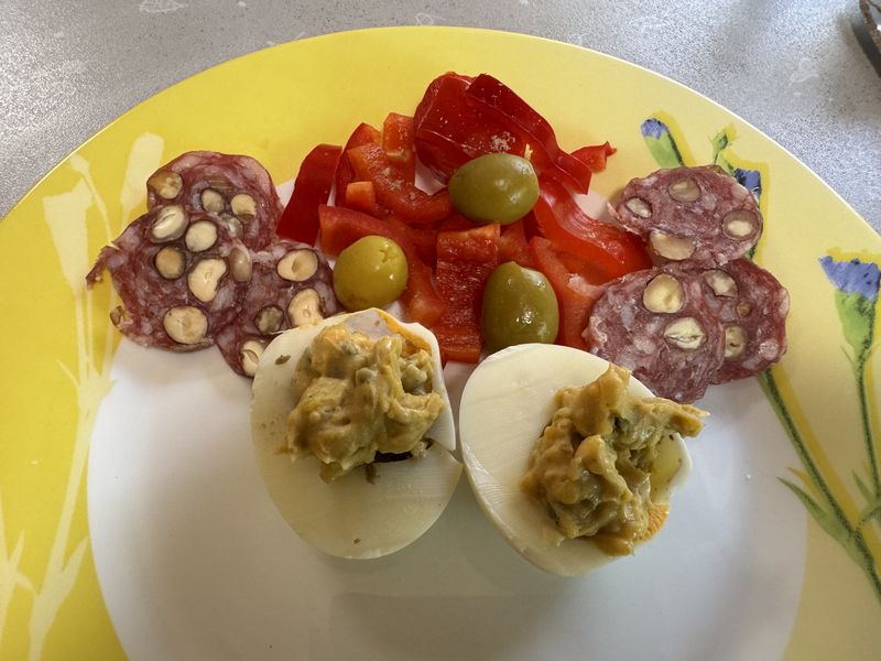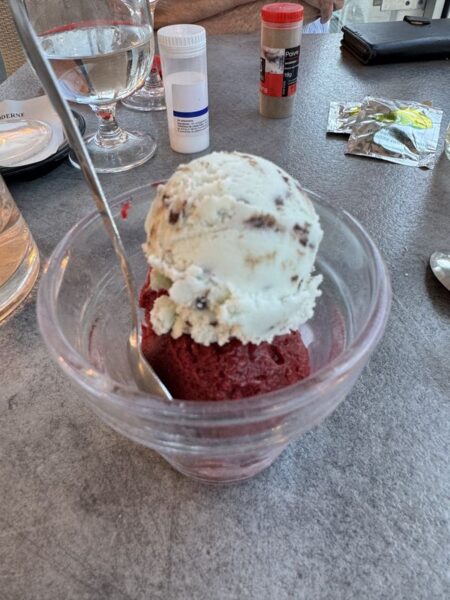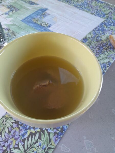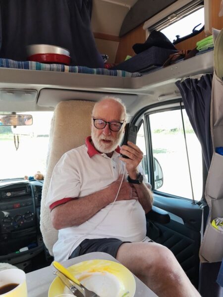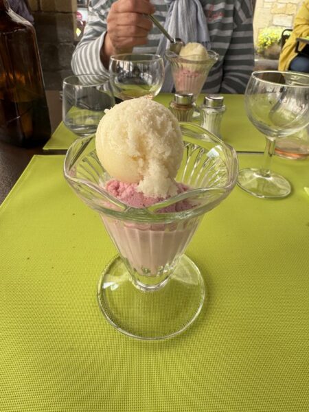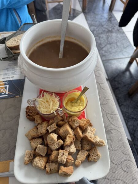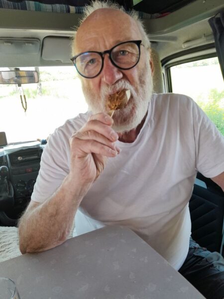 Auf der N6 bzw. D974 fahren wir über Chalons-sur-Saone und Dijon bis nach Goncourt, auf den kostenlosen Wohnmobil-Stellplatz mit V+E. Es war eine harte Tour. Unterwegs erhole ich mich während der Herstellung eines kleinen Vorspeisentellers und unserem Allzweckshilfsmittel – Leberknödelsuppe von ALDI. Wir haben nämlich keine Anlaufstelle für ein Mittagsessen gefunden. Zum Nachtisch hole ich noch Eis am Stiel aus dem Gefrierfach des Kühlschranks.
