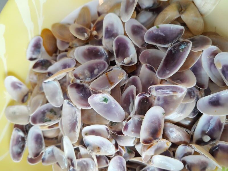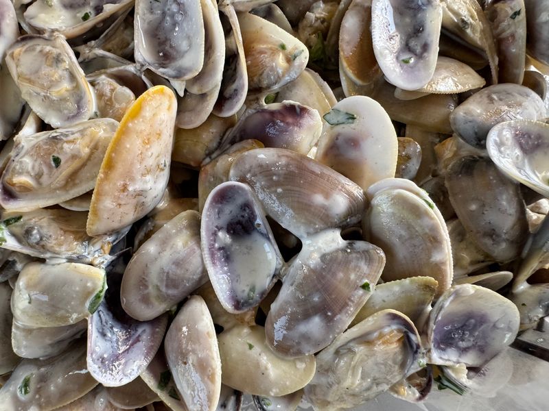 Etwas ganz besonderes in Saintes Maries sind die Tellines en persillade. Wir lieben besonders noch die frühere Machart, bei der zu der Knoblauchmayonnaise und der Petersilie noch ein wenig Dijonsenf eingerührt wird.