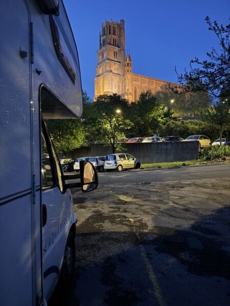 Der Regen wird immer stärker, und die Sicht schlechter. Etwa drei Stunden später erreichen wir kurz vor 16.00 Uhr den kostenlosen Stellplatz ohne V+E in Albi. Er ist Teil eines Großparkplatzes, direkt an der Altstadt. In Albi sieht man wenigstens zwischen den grauen Wolken wieder ein paar blaue Flecken.