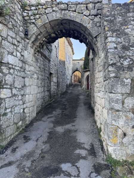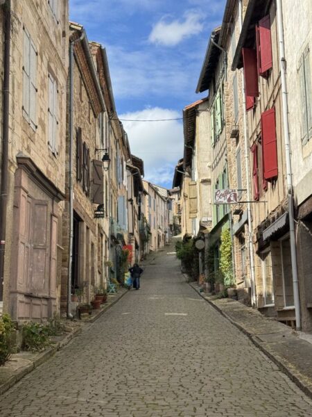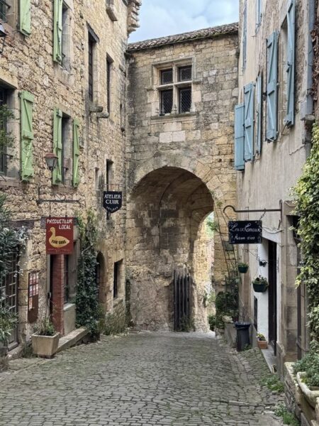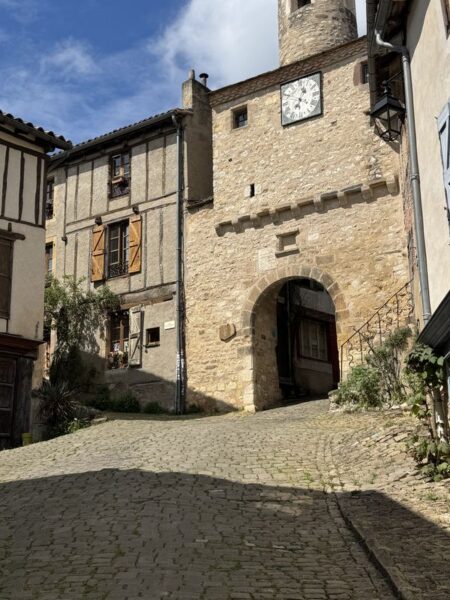 Ob die Bergkuppe vor dem Bau einer Bastide (befestigte Dörfer bzw. Städte) im 13. Jhdt. schon einmal besiedelt war, ist nicht bekannt. Auf jeden Fall sind wir ganz schön am schnaufen, und müssen desöfteren Pausen einlegen. Unser Eingang zur Bastide ist an der unteren Befestigung die spätmittelalterliche Porte D’Horloge.