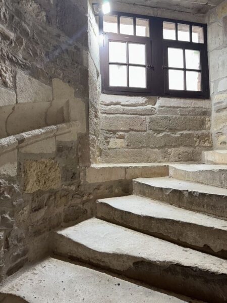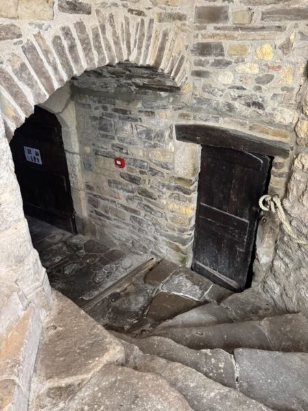 Neben den ausgetretenen Steinstufen gibt es bei der Wendeltreppe aber auch noch einen steinernen Handlauf.