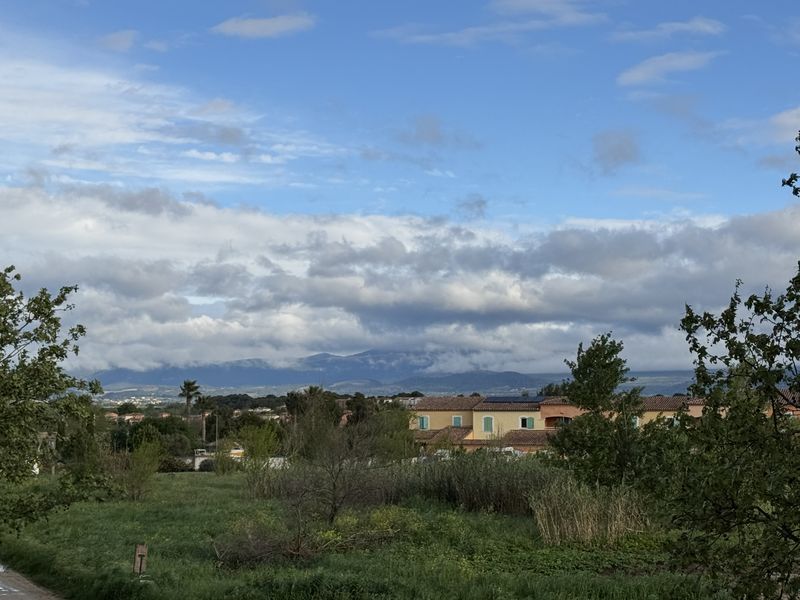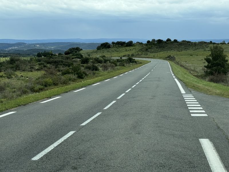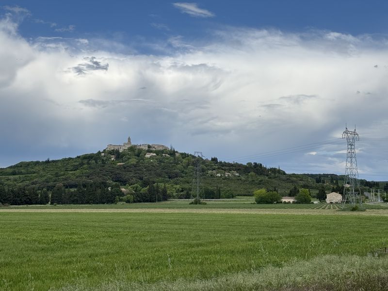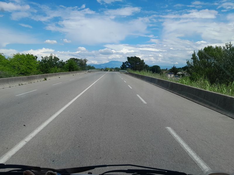 Weithin sichtbar, mal uns voraus oder rechts von uns, ist der Mont Ventoux mit seinem durch Wolken verhüllten Hauptes zu sehen.