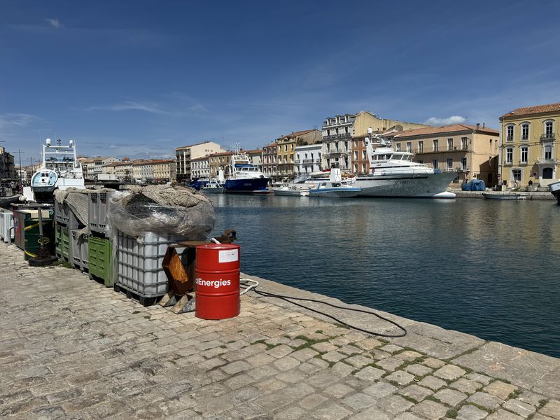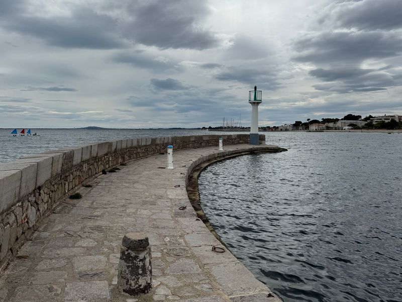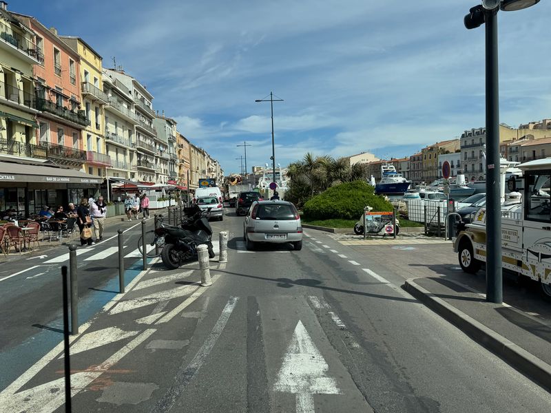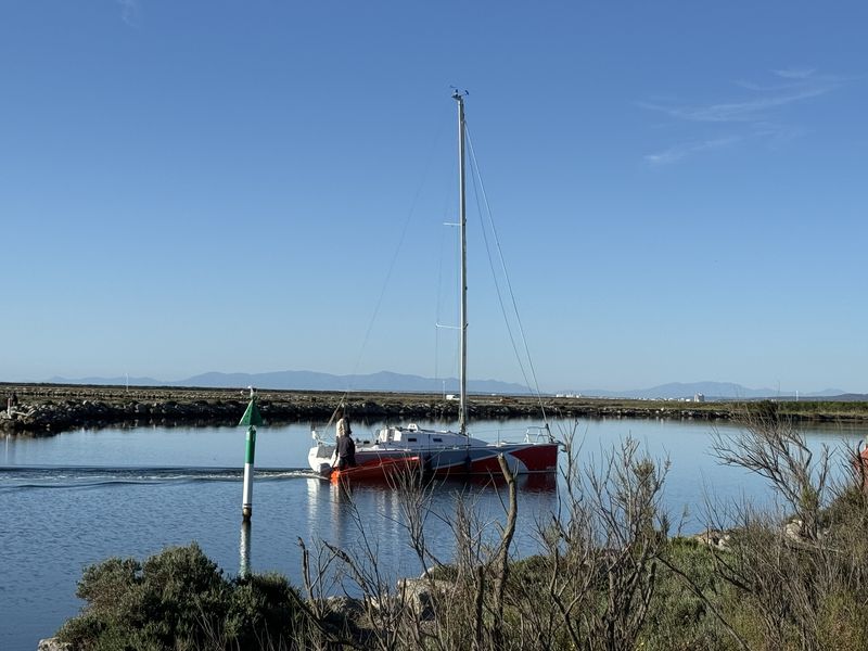 Der Tag begrüßt uns tatsächlich mit Sonne und blauem Himmel, auch wenn ein paar graue Wolken noch über den Bergen hängen. Ich mache mich auf den Weg in den Ort, um ein frisches Baguette und zwei Croissants zu erstehen. Mit Erfolg! Auf der anderen Seite des Hafens gibt es in einer Gasse einen kleinen Lebensmitteladen.