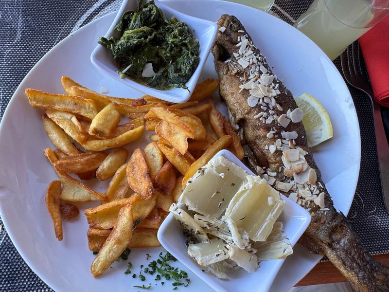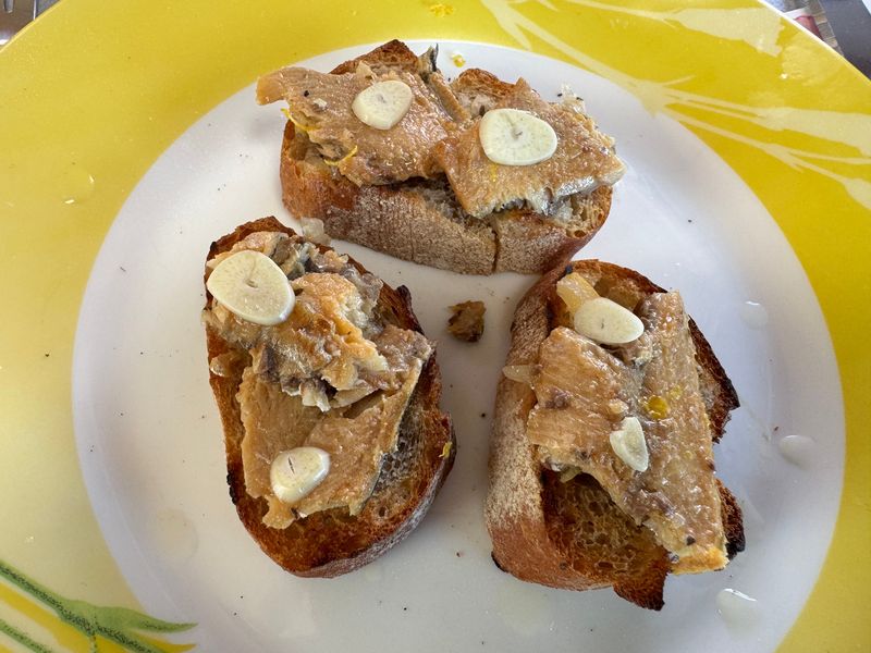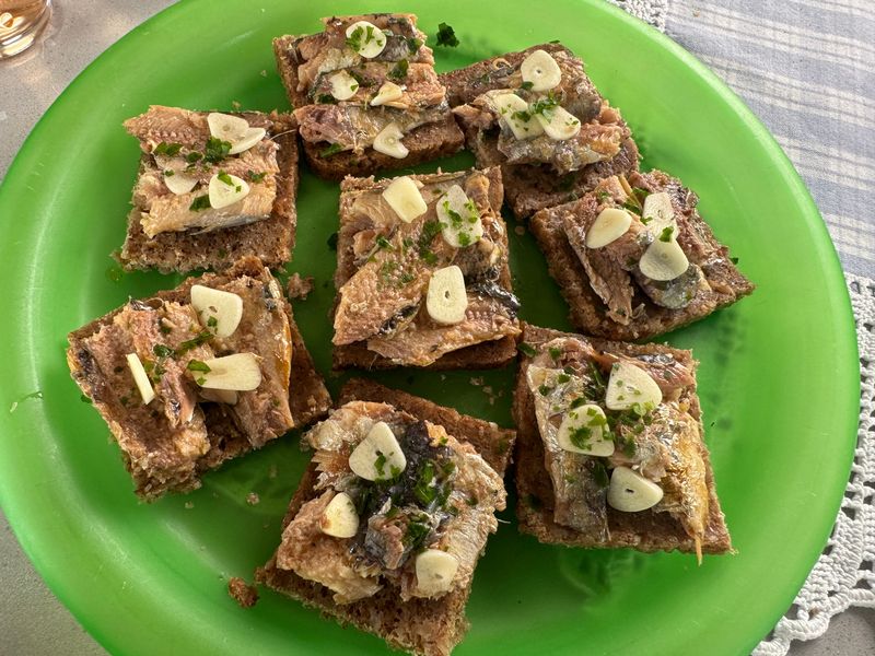 Bevor wir uns auf den Weg machen um nachzuschauen, ob sich der Ortskern verändert hat, essen wir ein paar Happen Sardinenbrote mit Knoblauch und Petersilie.