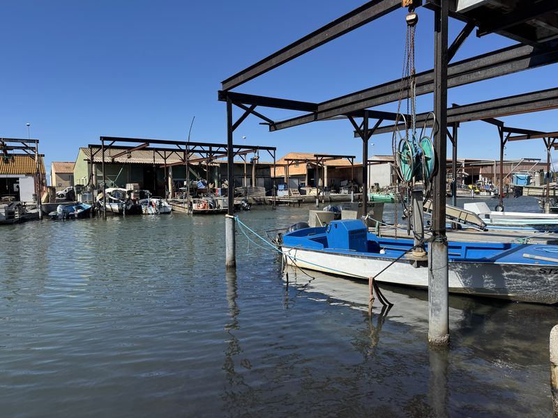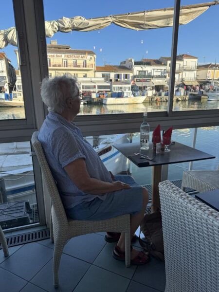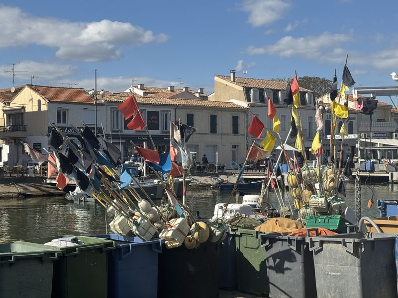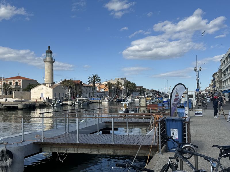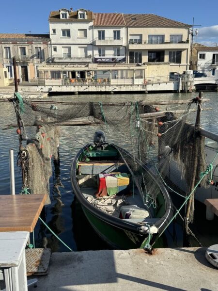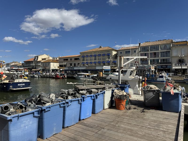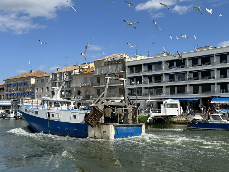 Wir halten uns gar nicht lange auf, und gehen sofort in das Zentrum von Le Grau du Roi, den beidseitig begehbaren Hafen. Hier ist immer etwas los. Gerade kommen die Fischerboote zurück. Jedes Boot hat zahlreiche Möwen im „Schlepptau“.