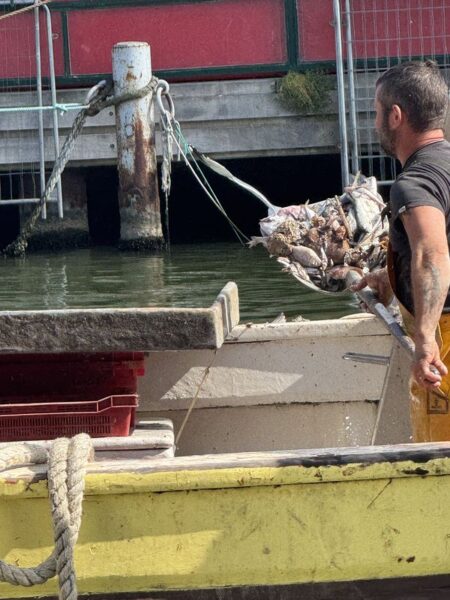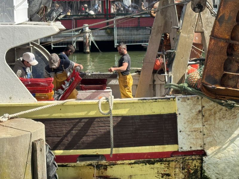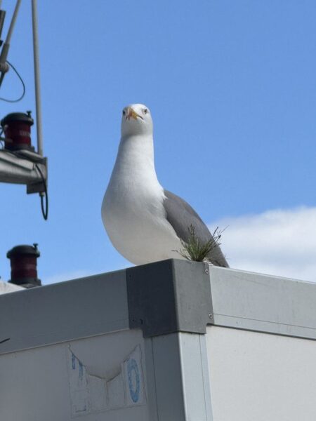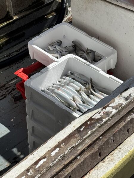 Die Bootsbesatzungen fangen sofort mit den Sortierarbeiten und der Entladung der Schiffe an. Währenddessen warten die Möwen auf ihren Anteil, wie zum Beispiel den Beifang, der über die Reling entsorgt wird.
