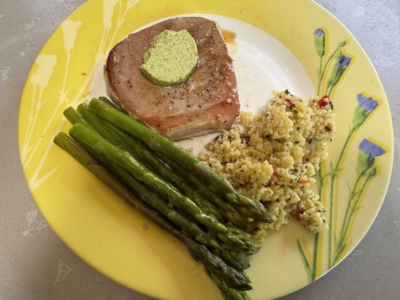 Den sonnigen Morgen lassen wir ganz ruhig angehen. Trödeln uns sozusagen in den Tag. Gegen Mittag machen wir uns für jeden eine kleine Vorspeiseplatte und ein kleines Thunfischsteak, grünen Spargel und Taboulé Orientale.