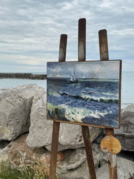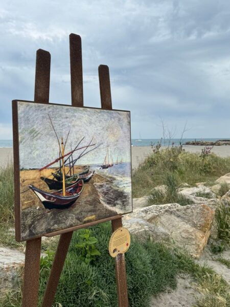 Bei unserem Spaziergang auf der Uferpromenade fallen uns Staffeleien mit Reproduktionen von Vincent van Gogh auf. Dieser Maler hat im Mai 1888 einige Zeit in Saintes Maries verbracht und Studien für seine späteren Gemälde „Fischerboote bei Saintes Maries“ und „Fischerboote am Strand von Saintes Maries“ angefertigt.