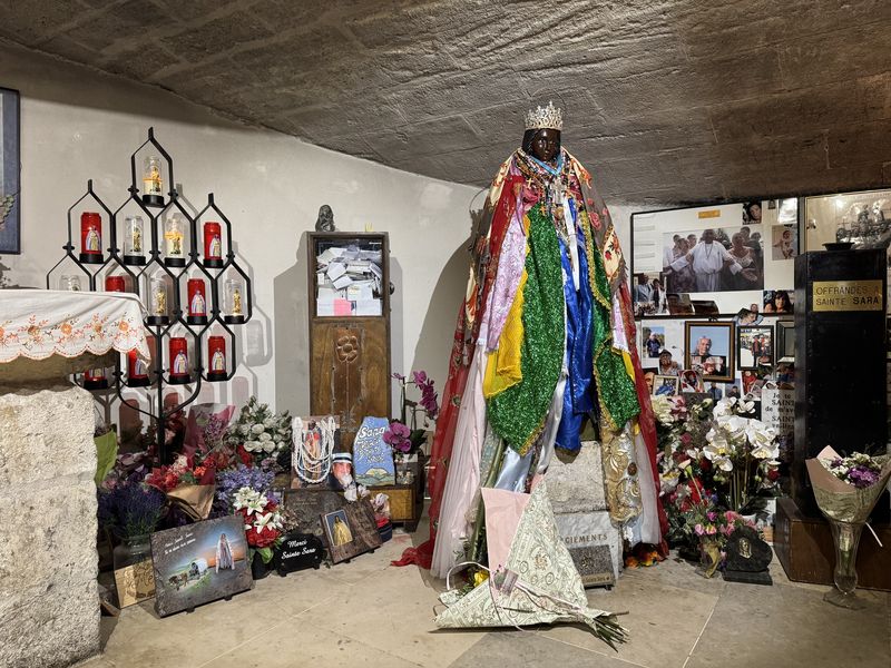 In der Kirche werden die angeblichen Reliquien der beiden Heiligen Maria Kleophae und Maria Salome verehrt, die hier mit einem Boot angelandet sein sollen. Deshalb wird bei den Wallfahrten im Mai und Oktober eine Statue der beiden Heiligen ins Meer getragen. Die Gitans machen an dem Maitermin ebenfalls eine Wallfahrt zu Ehren ihrer Schutzheiligen, der Schwarzen Sara. Manche meinen, sie sei die Dienerin der beiden Marien gewesen.