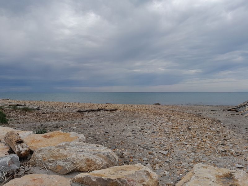 Der Himmel hat an der Küste seine Farbe von blassblau auf zahlreiche Grautöne verändert.