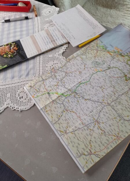 Am Spätnachmittag hat Lena unseren Tisch im Wohnmobil in Beschlag genommen, um unser Urlaubs-Tagebuch fortzusetzen. Seit 1975 haben wir in Ringbüchern Aufzeichnungen zu unseren Reisen aufgeschrieben.