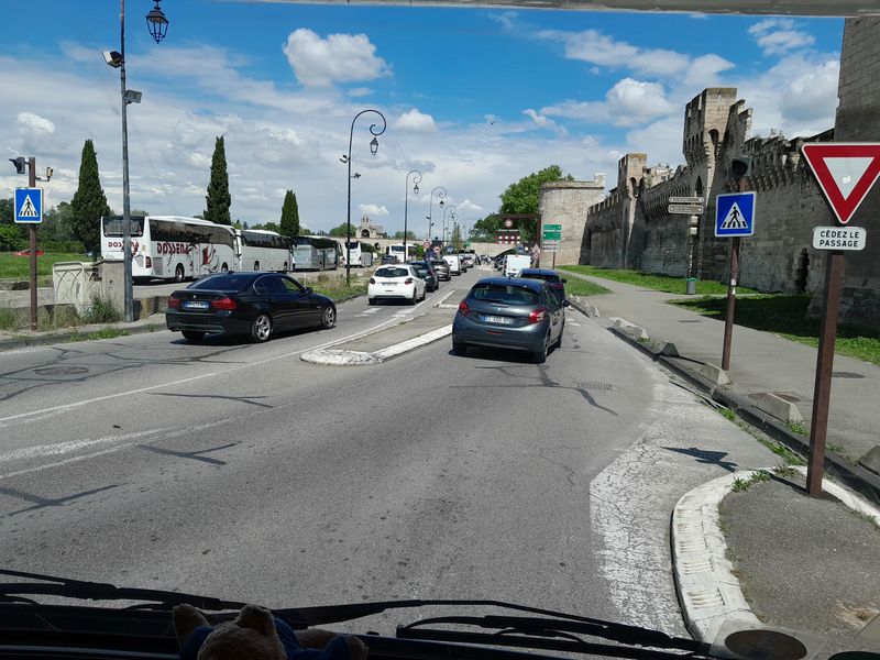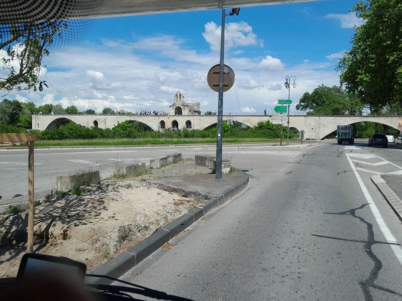 Irgendwann müssen wir uns aber doch von Saintes Maries trennen. Wir fahren über Arles und Avignon ins Rhone-Tal hinein. Die Nationalstraße führt bei Avignon an der historischen Stadtmauer entlang und unter der Pont Saint-Bénezet (der Pont d’Avignon) hindurch.