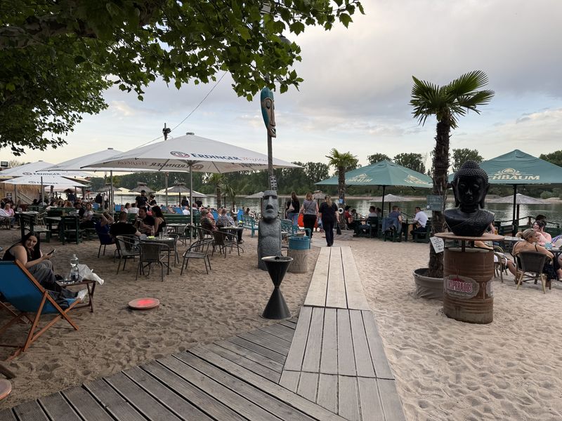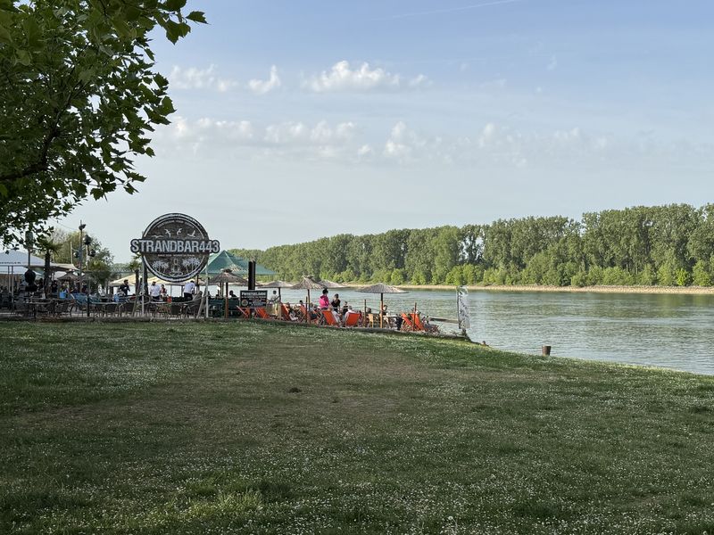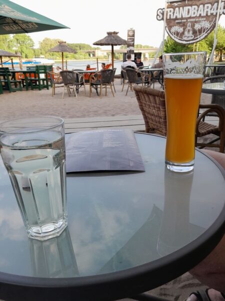 Bei unserem Spaziergang an den Rhein sehen wir, dass es ja eine Strandbar gibt. Das ist schön und genau richtig für uns.