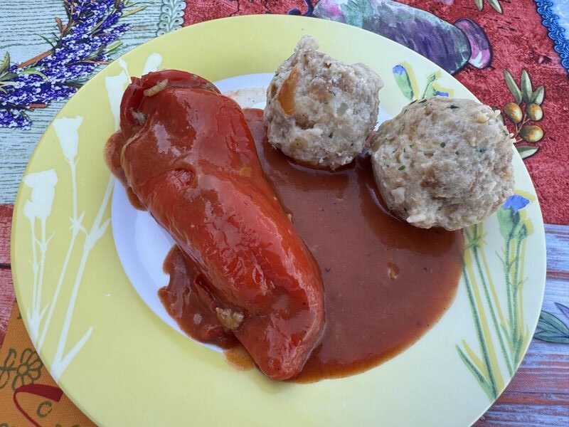 Lena macht uns vor Ort gefüllte Paprika mit Semmelknödeln.
