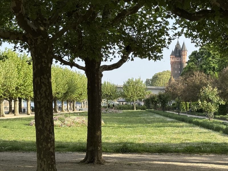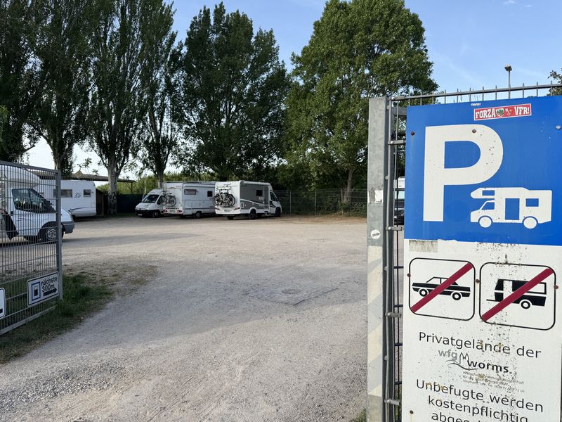 Bei der Ankunft in Worms ist der Stellplatz ohne V+E (Gebühr EUR 6,00) entgegen unseren Befürchtungen nur wenig besucht. Es ist schwierig, bei einem so leeren Platz sich für eine Bucht zu entscheiden. Ein Schattenplatz ist schon gut.